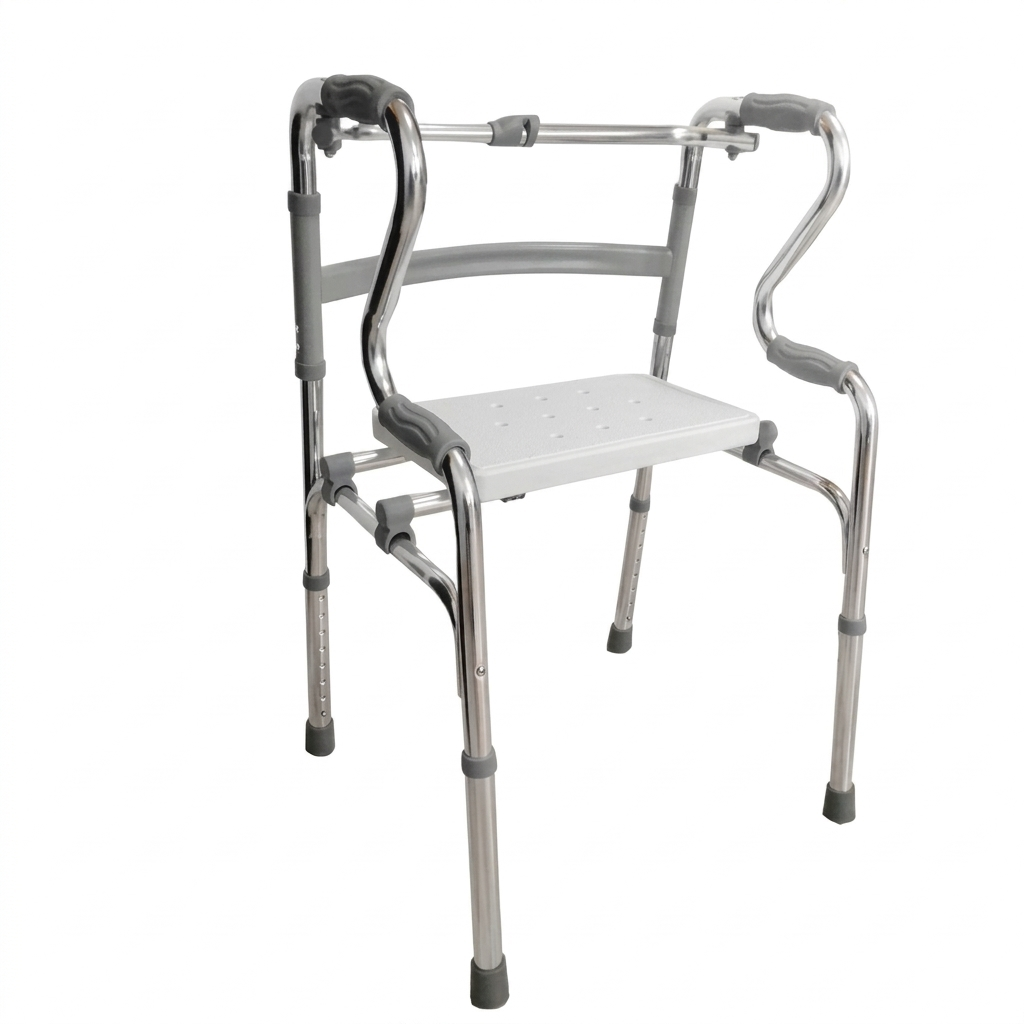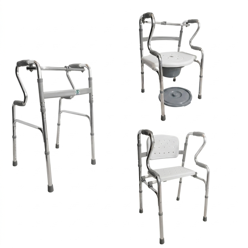 Esta andadera multifuncional se transforma en 6 configuraciones distintas para acompañarte en cada etapa: desde asistencia de marcha estándar y con ruedas, hasta apoyo para levantarse del inodoro o soporte de seguridad en el baño.