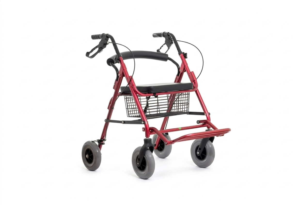 Este Rollator de Mirrimex en un vibrante color rojo combina la agilidad de sus ruedas de 8 pulgadas con la practicidad de un asiento acolchado y una canastilla metálica. Es la compañera ideal para usuarios activos que buscan independencia en sus traslados diarios y un lugar seguro para descansar en cualquier momento.