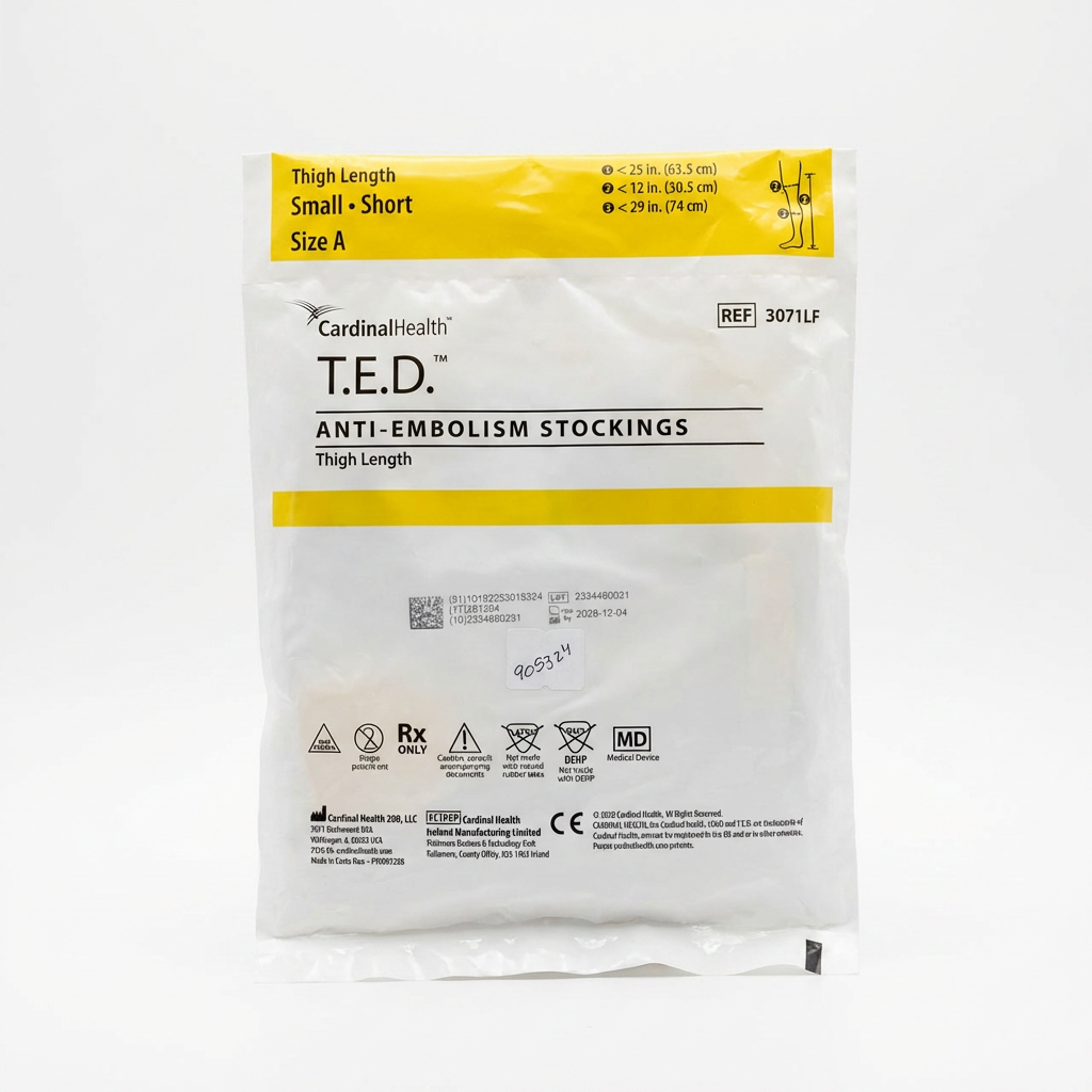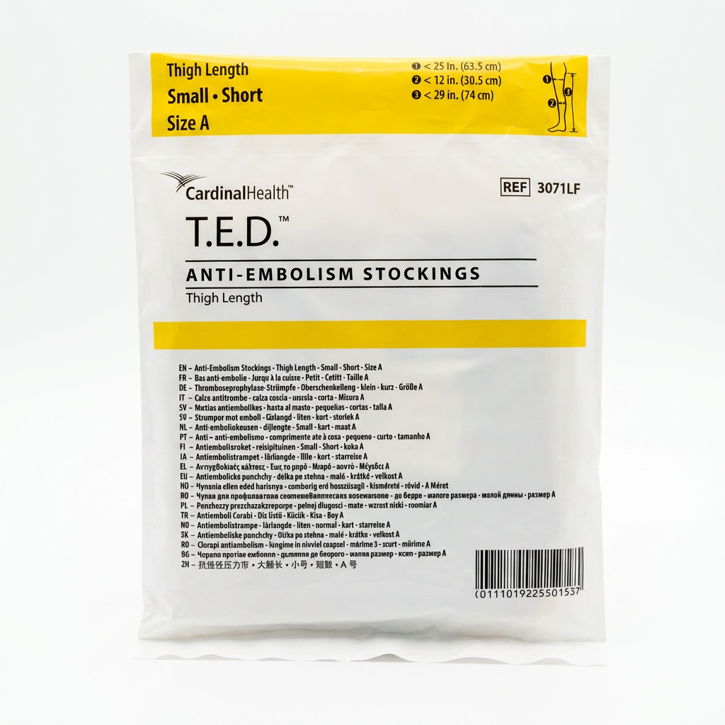 Las medias antiembólicas T.E.D. (Thrombo-Embolic Deterrent) de muslo talla chica son dispositivos médicos de compresión graduada diseñados para la prevención de trombosis venosa profunda (TVP) en pacientes no ambulatorios o en reposo prolongado. Su sistema de presión distribuida favorece el retorno venoso hacia el corazón, reduciendo en un 50% el riesgo de formación de coágulos en las extremidades inferiores.